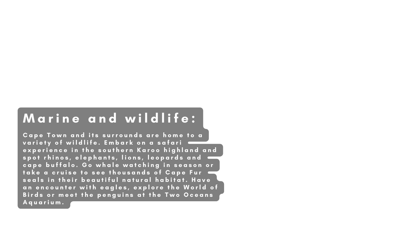 From June to November each year, the whales are in town! You can try to spot the Southern Right, Humpback and Bryde whales in the deep blue sea during this time. The Whale Coast offers plenty of viewpoints, and the quaint seaside towns provide plenty of arts and culture attractions. Whale season also coincides with the wildflower season, so you can explore both simultaneously.
